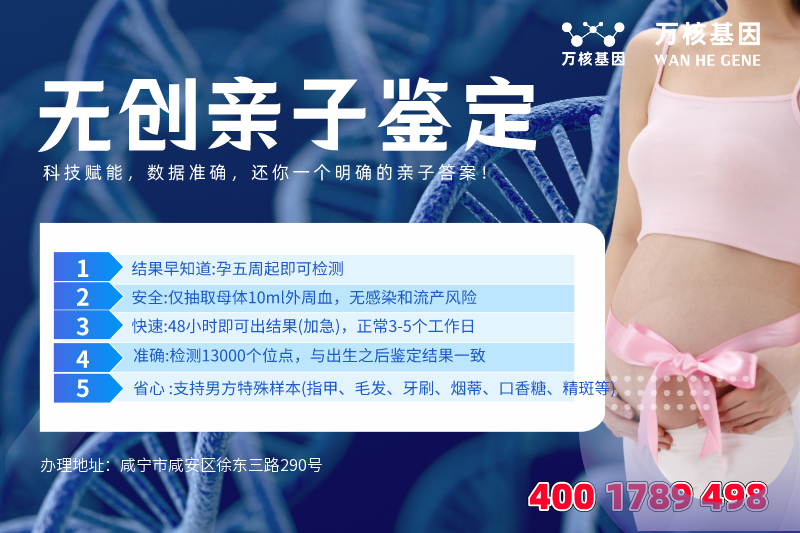 咸宁亲子鉴定基因检测是一家专门提供亲子鉴定服务机构,目前联合了多家权威法医物证司法鉴定及基因检测公司的亲子鉴定服务咨询机构。咸宁办理地址:咸宁市咸安区徐东三路290号(如需办理,需提前预约)预约电话:4001789498,在全国各地都设有亲子鉴定分部受理点及联系方式,常年为国内外客户提供专业权威的DNA亲子鉴定服务。轻松办理亲子鉴定、个人亲子鉴定、移民亲子鉴定、上户口亲子鉴定、亲缘亲子鉴定、孕期亲子鉴定(孕5周即可检测,安全放心,保护客户隐私,覆盖全国)报告国内外通用,正规亲子鉴定机构。